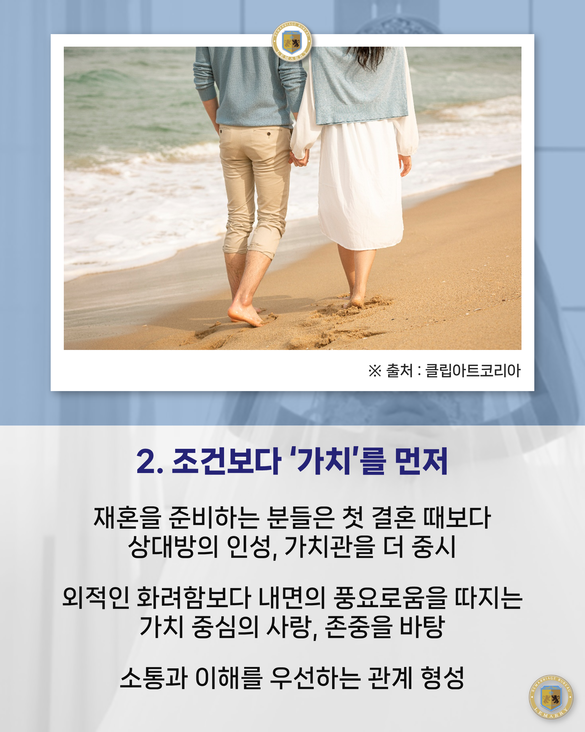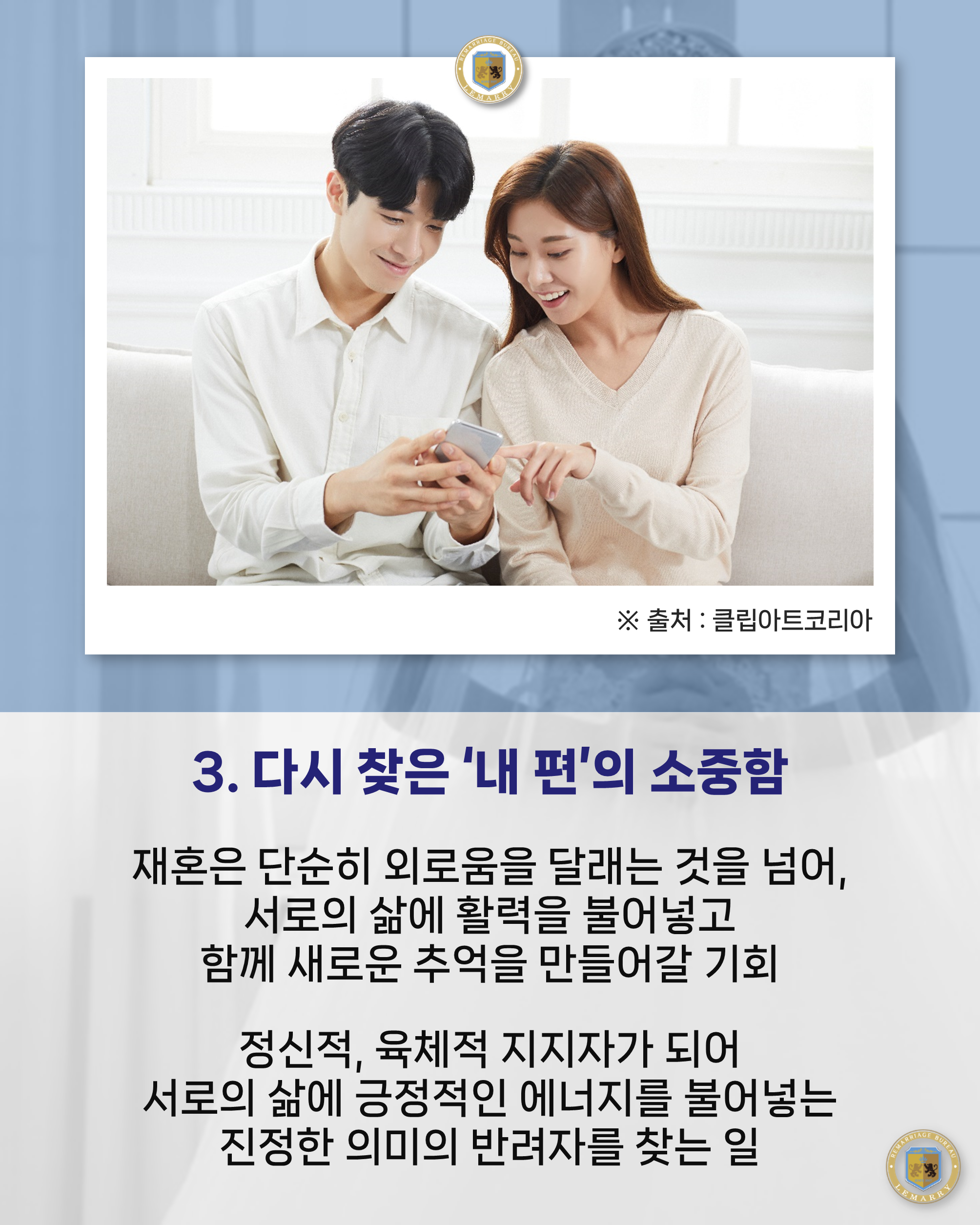 재혼은 정신적, 육체적 지지자가 되어 서로의 삶에 긍정적인 에너지를 불어넣는, 소중한 반려자로서 행복을 누릴 수 있는 기회입니다.