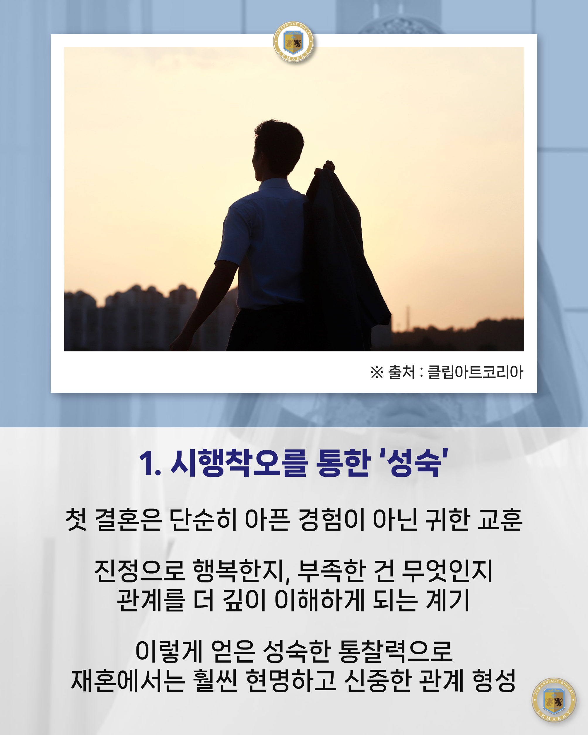첫 결혼의 경험은 단순히 아픈 기억이 아니라, 귀한 삶의 교훈이 됩니다. 이런 경험을 통해 나와 상대방에 대해 더 깊이 이해할 수 있게 되죠. 어떤 관계가 진정으로 행복하고, 어떤 부분이 부족했는지, 관계에 있어 내가 제일 중요하게 생각하는 부분은 무엇인지와 같은 다양한 깨달음을 얻고 더 깊이 이해하게 되는 계기입니다.