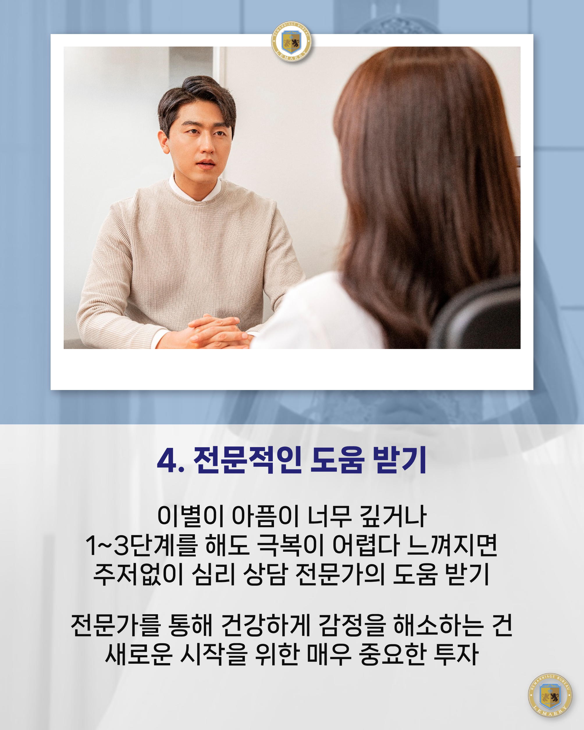 때로는 혼자만의 힘으로 감당하기 힘든 감정들이 있습니다. 이러한 감정을 전문가의 도움을 받아 건강하게 해소하는 것은 새로운 시작을 위한 매우 중요한 투자입니다. 르매리는 조언과 상담을 통해 회원분들이 심리적으로 안정되고 행복을 찾을 수 있도록 함께 노력하는 재혼 전문가들로 구성되어 있습니다.