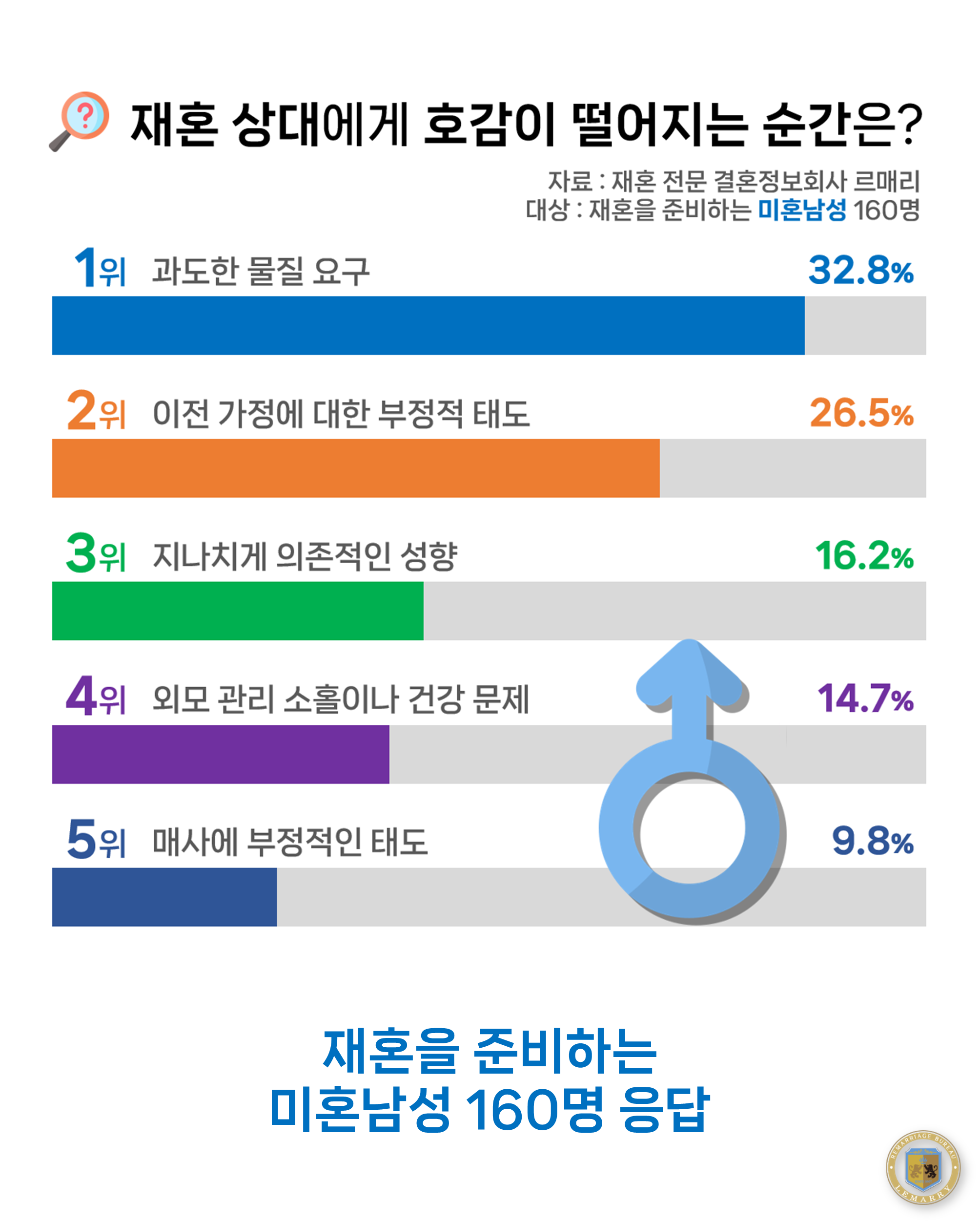 저희 르매리 이번에 흥미로운 설문조사를 진행했습니다. 재혼을 준비하는 미혼남녀 320명(남성 160명, 여성 160명)을 대상으로 ‘재혼 상대에게 호감이 떨어지는 순간’에 대한 답변을 받아본 것인데요.