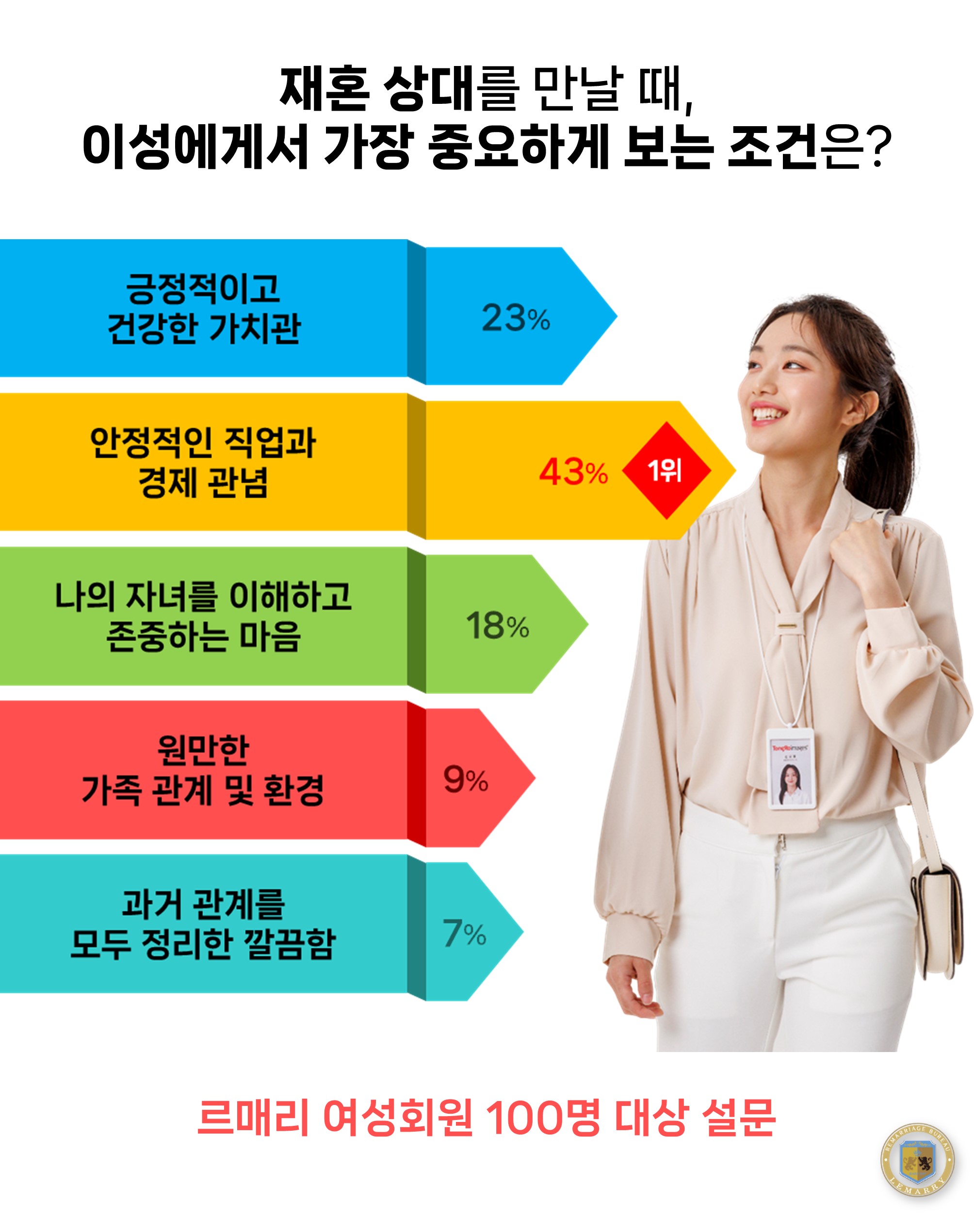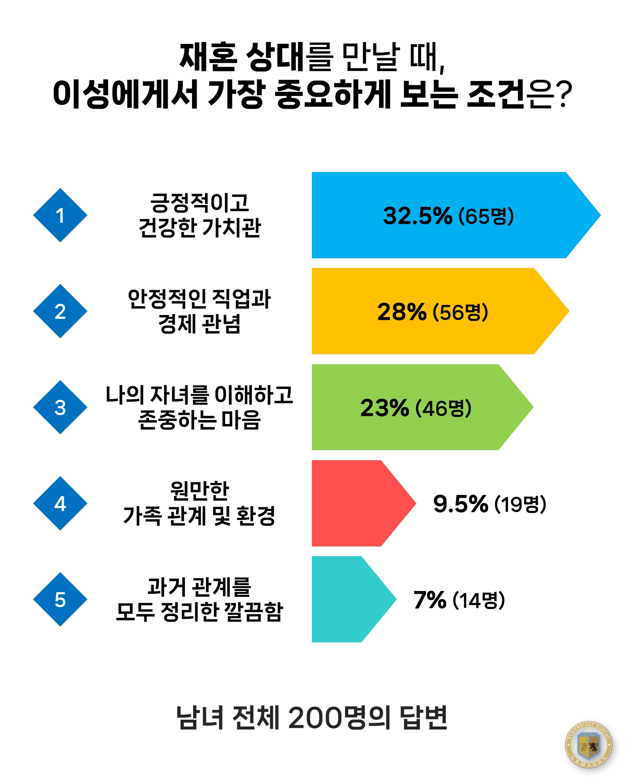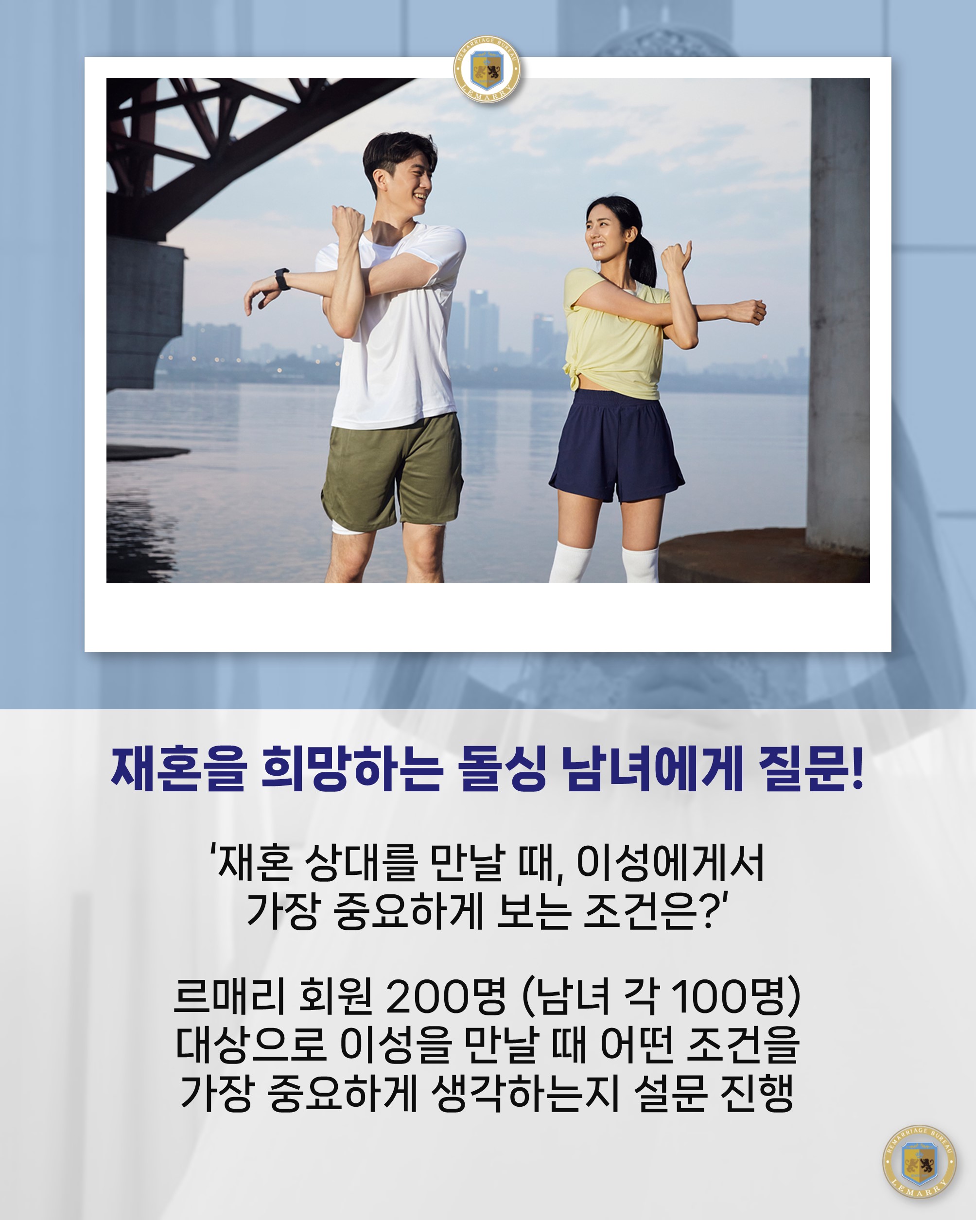 저희 르매리 이번에 흥미로운 설문조사를 진행했습니다. 재혼을 준비하는 르매리 회원 미혼남녀 200명(남성 100명, 여성 100명)을 대상으로 ‘재혼 상대를 만날 때, 이성에게서 가장 중요하게 보는 조건’에 대한 답변을 받아본 것인데요. 상류층 재혼, 재력가 재혼, 전문가 재혼, 의사 재혼 등 다양한 계층의 회원분들이 설문에 참여해 주셨습니다.