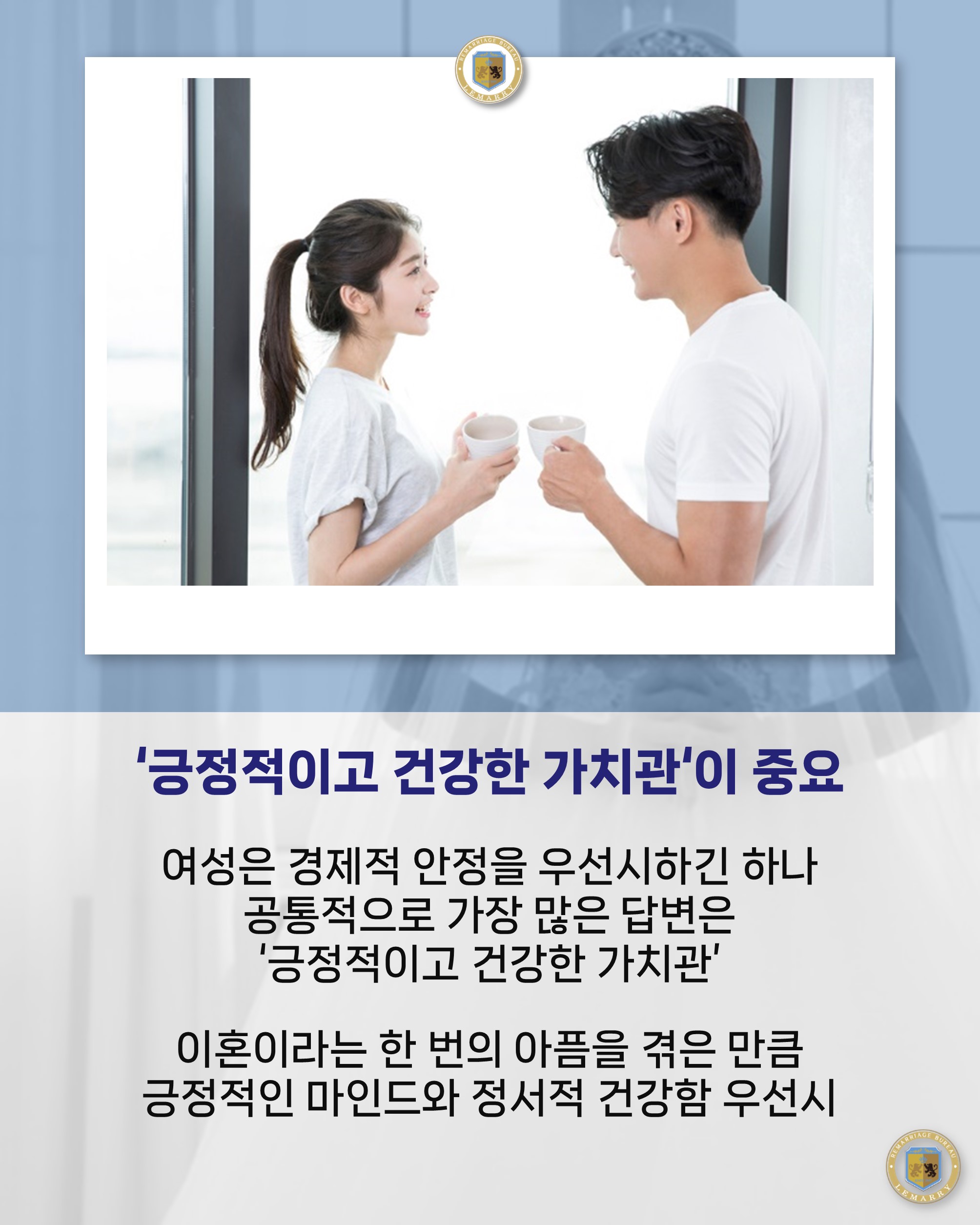 이혼이라는 큰 아픔을 한 번 겪은 만큼, 새로 출발하기 위해서는 상대방의 정서적 환경을 중시하게 된다는 답변이 많았습니다. 정서적으로 안정되고 건강한 모습, 긍정적인 모습이 좋은 결혼생활로 이어질 수 있다고 많은 분들이 느끼셨다는 거겠죠.