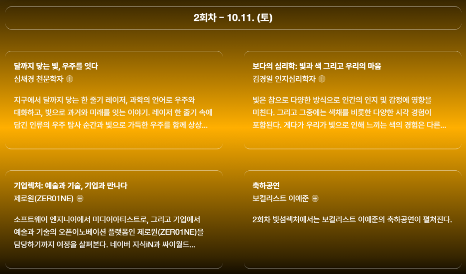 예술가, 과학자, 기술 전문가, 그리고 기업인들이 각자의 분야에서 품어온 질문을 예술 × 기술을 매개로 풀어가는 강연입니다. 모든 발표는 쉽고 흥미로운 ‘페차쿠차’(20장의 이미지를 각각 20초씩 보여주며 전개되는 스토리텔링 형식의 발표) 형식으로 진행되어 부담 없이 핵심 내용을 이해하고 몰입할 수 있도록 구성됩니다.