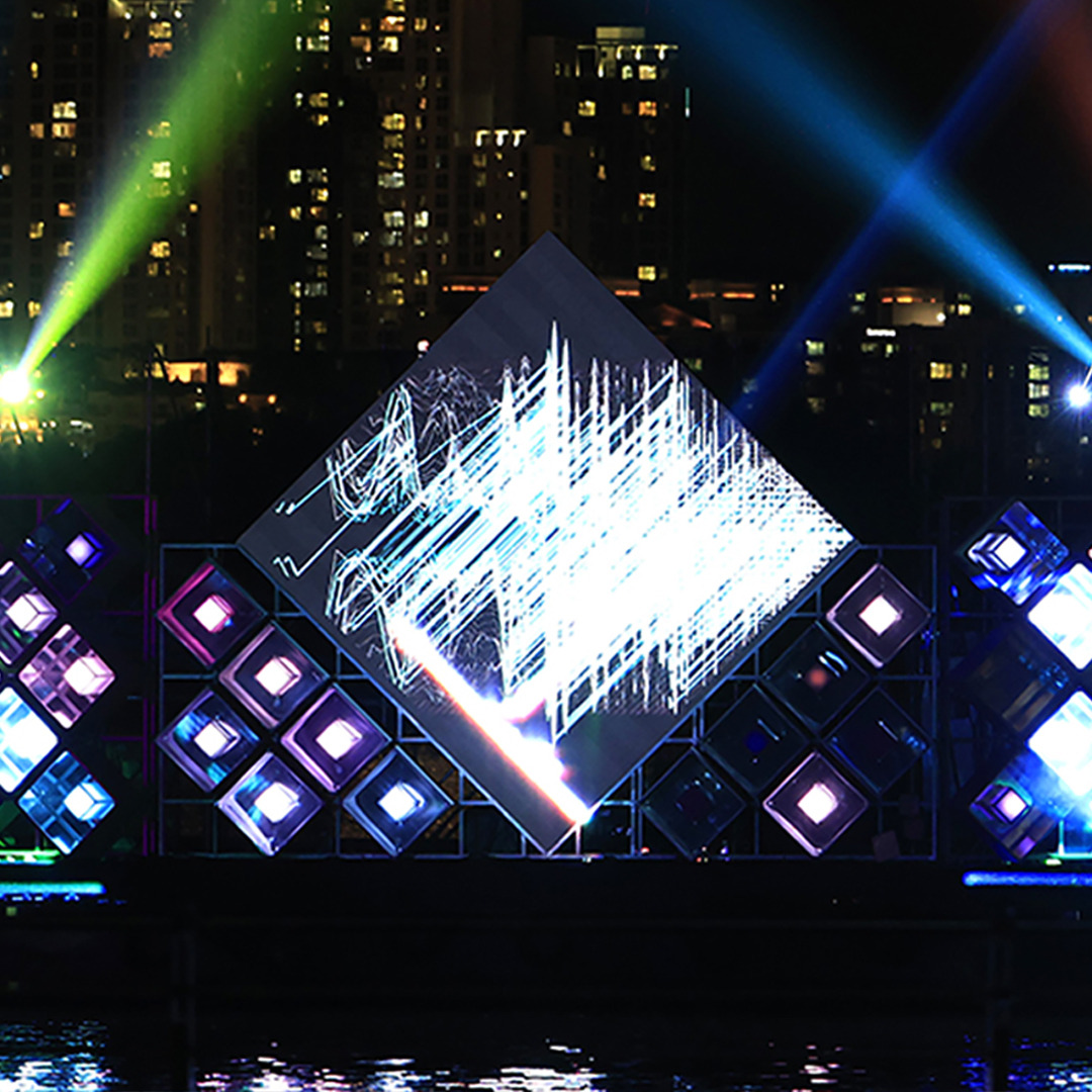 뚝섬은 도심에 자리하고 있으면서도 여전히 섬으로서의 고립성과 개방성을 동시에 품고 있으며, 자연과 도시, 물과 육지가 교차하는 경계적 공간입니다. 레이저아트 전시는 뚝섬이라는 장소의 특성을 바탕으로, 과거 유원지의 기억과 현재의 도시 리듬, 그리고 미래적 기술이 공존하는 감각적 풍경을 조성하였습니다.