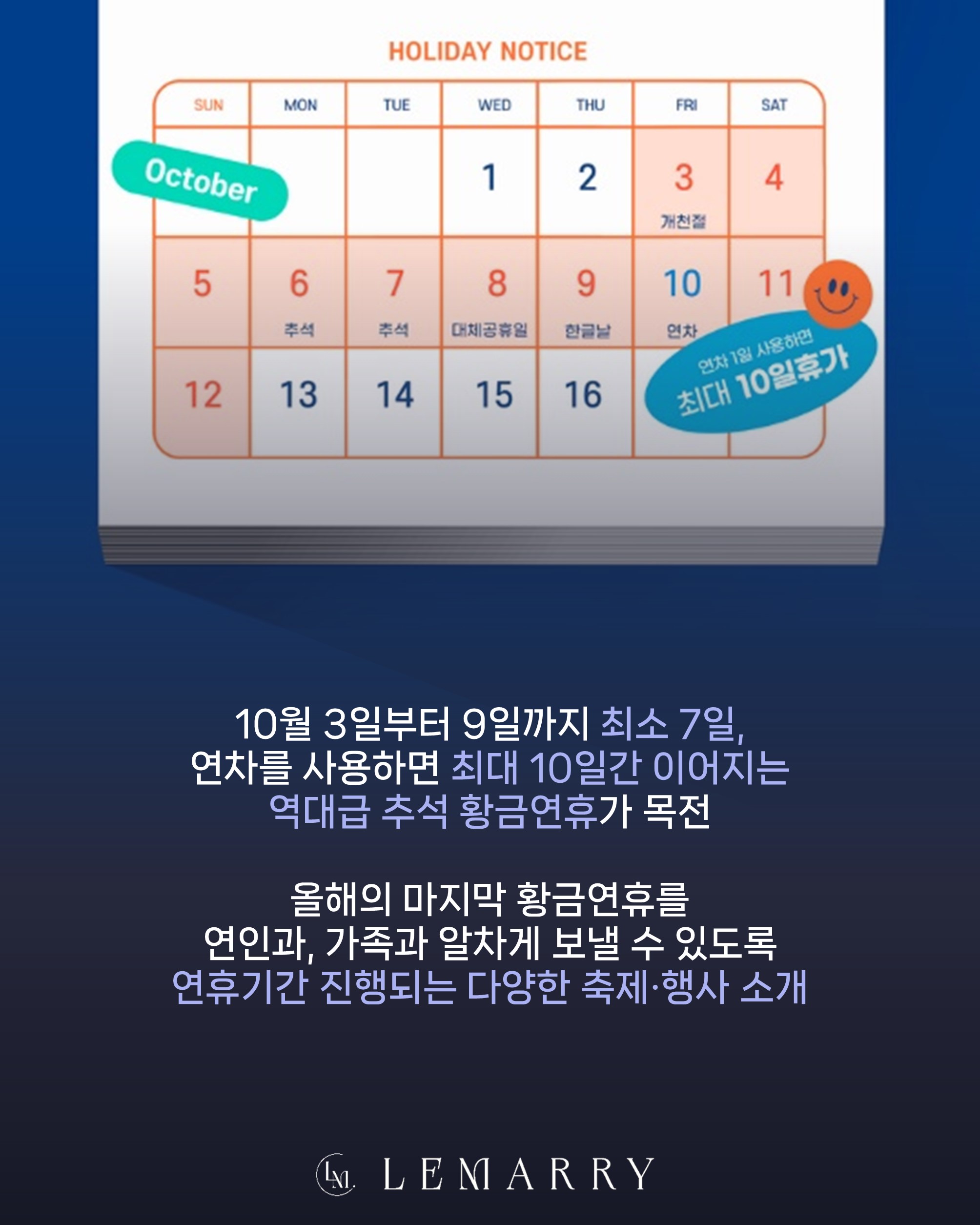 올해 마지막 황금연휴인 만큼 연인과, 가족과 알차게 보내실 수 있기를 바라는 마음에서 르매리가 다양한 축제와 행사를 소개드리고 있으니 좋은 정보 얻어가시기 바랍니다.