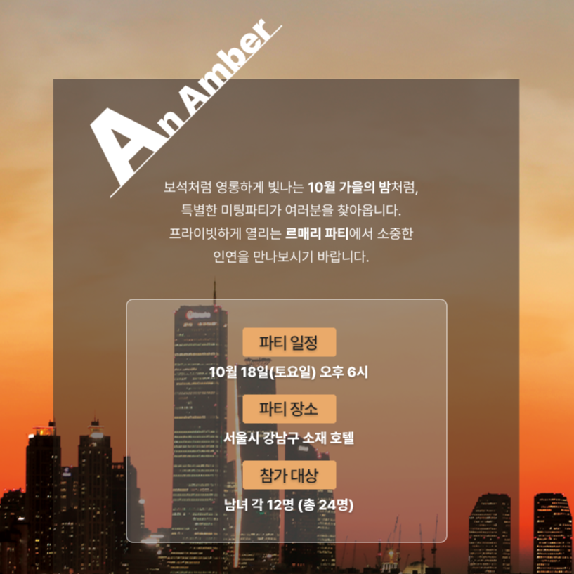 보석처럼 영롱하게 빛나는 10월 가을의 밤처럼, 특별한 미팅파티가 여러분을 찾아옵니다. 프라이빗하게 열리는 르매리 파티에서 소중한 인연을 만나보시기 바랍니다.