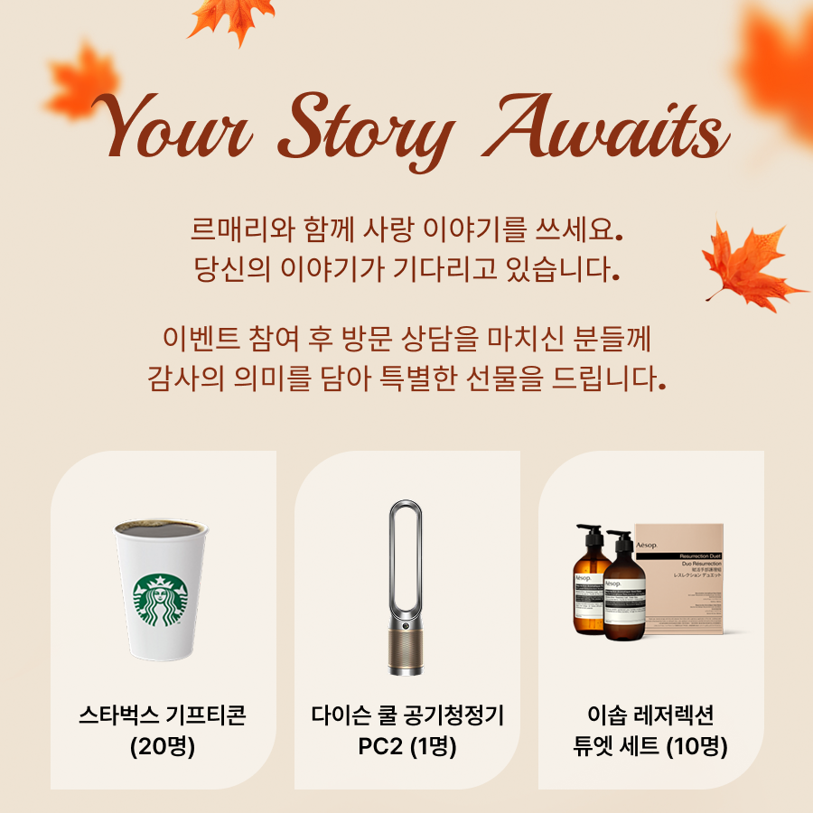 르매리는 국내 대표 재혼전문 결혼정보회사로서, 회원 분들을 위한 다양한 이벤트를 매월 주최하고 있습니다. 방문 상담을 받는 것만으로도 풍성한 선물을 받을 기회를 얻으실 수 있습니다.
