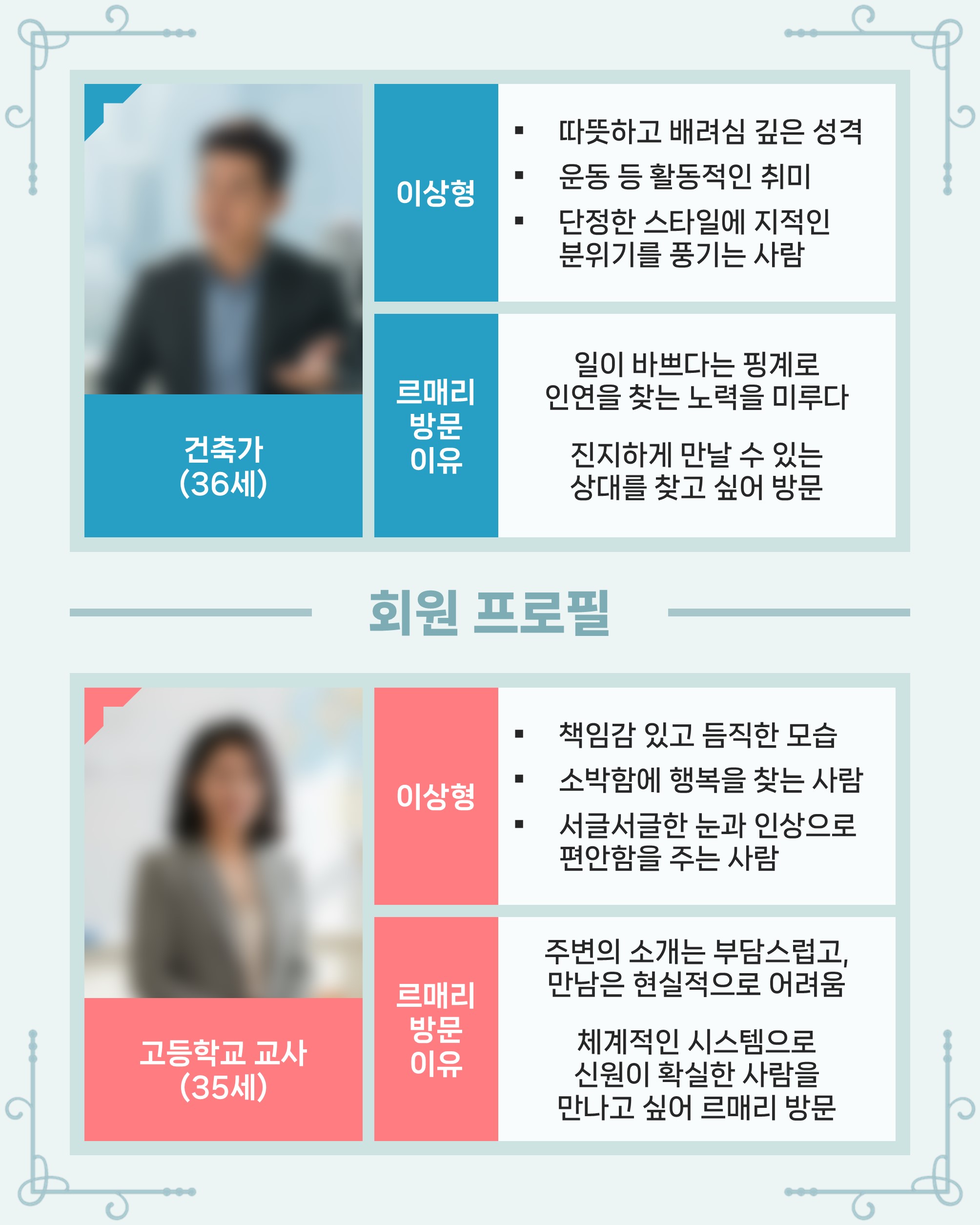 주변에 소개를 받기는 부담스럽고, 진지하게 신원이 확실한 사람을 만나고 싶어 고민하셨다고 합니다. 체계적으로 매칭을 해주는 르매리의 시스템을 믿고 방문해주신 분들이기에 이상형과 여러 현실적인 분들을 고려하여 세심한 매칭을 진행하였습니다.