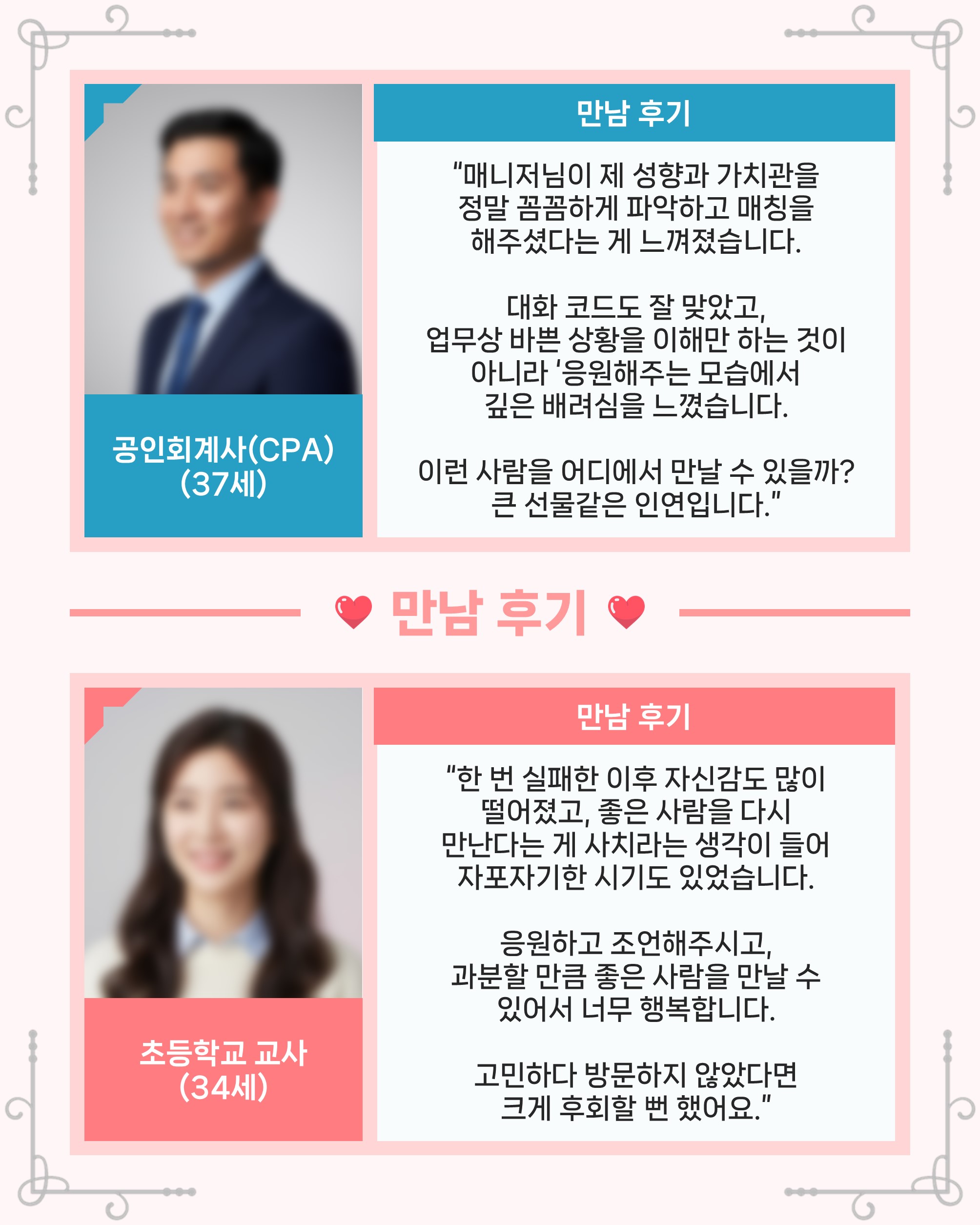 남성분은 "매니저님이 제 성향과 가치관을 정말 꼼꼼히 파악해 매칭해주셨다는 게 느껴졌다. 깊은 배려심이 느껴졌고, 어디에서 이런 사람을 만날 수 있을까 싶었다"고 밝히시며 굉장한 만족감을 보이셨고, 여성분은 "과분할 만큼 좋은 사람을 만날 수 있어서 너무 행복하다. 방문하지 않았으면 크게 후회할 뻔 했다"고 말씀하셨습니다.