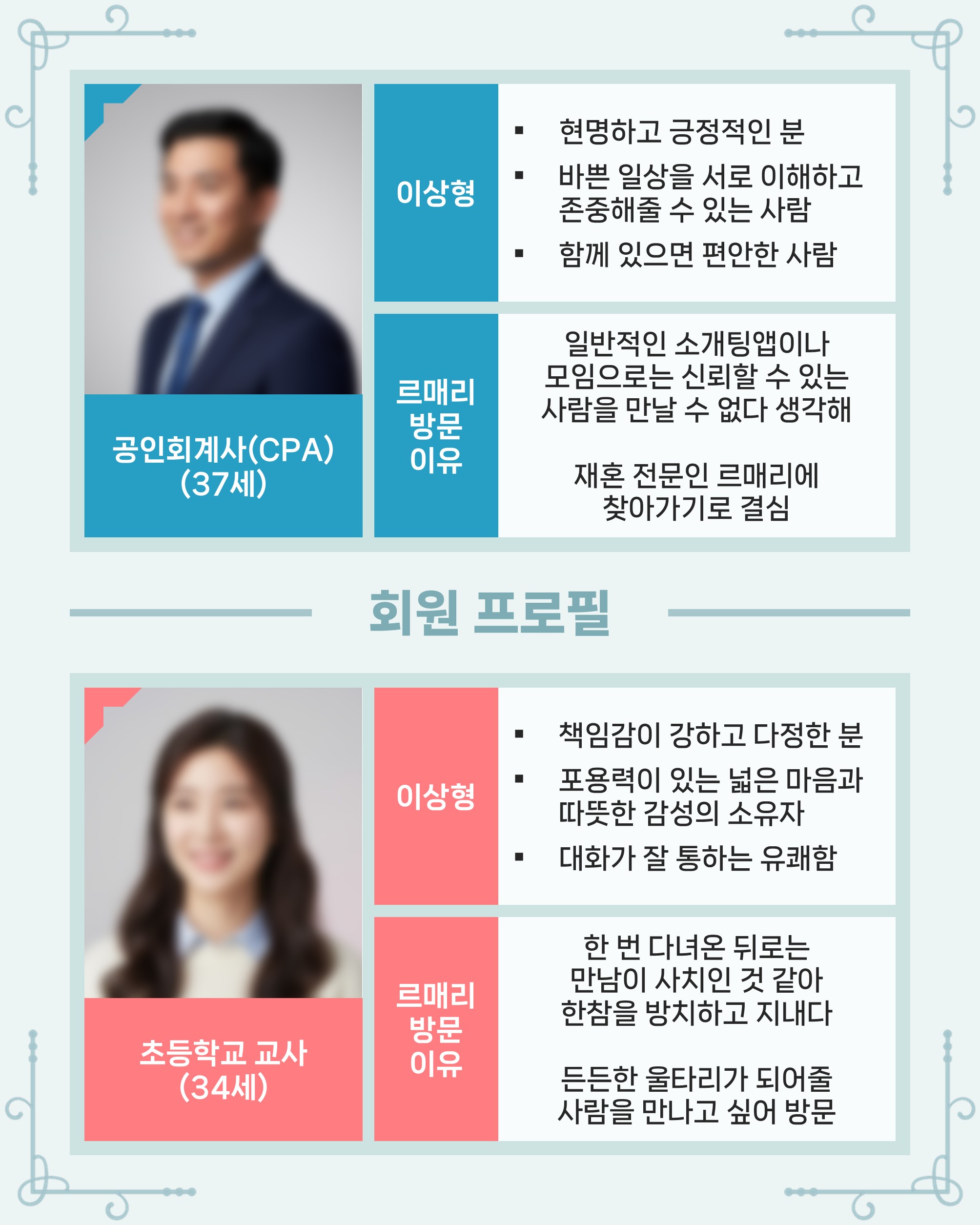 남성분은 신뢰하고 함께할 수 있는 사람을 찾고 싶은데, 일반적인 소개팅이나 모임을 나가는 걸로는 맞는 사람을 찾을 수 없다고 생각해 르매리에 방문주셨다고 합니다. 여성분은 이혼 후 만남이 사치인 것 같아 인연을 찾는 것을 포기했었다가, 삶에 든든한 울타리가 되어줄 사람을 만나고 싶어 문의를 주셨다고 하네요.