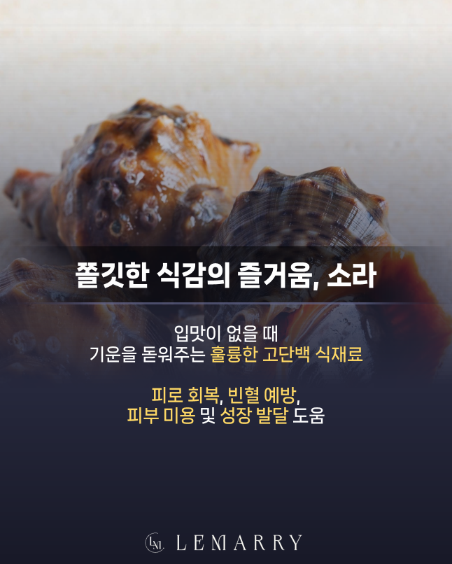 3월부터 6월까지가 제철인 소라는 입맛이 없을 때 기운을 돋워주는 훌륭한 고단백 식재료입니다.