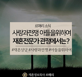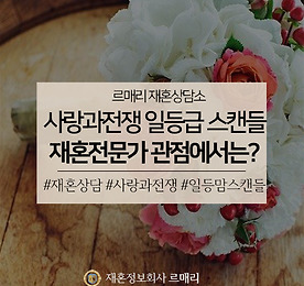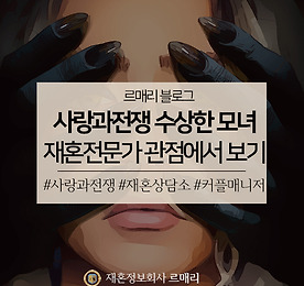 르매리 재혼상담소 썸네일형 리스트형 사랑과전쟁 아내를 죽이는 101가지 방법, 재혼전문가 관점에서 바라본다면? 안녕하세요, 재혼전문 결혼정보회사 르매리입니다. 돌싱커뮤니티에서도 장안의 화제를 몰고 있는 '르매리 사랑과전쟁' 코너입니다. 사랑과전쟁은 TV이혼법정으로 이름을 알린 '사랑과 전쟁' 속 에피소드를, 재혼전문 커플매니저 관점으로 바라보는 코너인데요. 이번 에피소드는 '사랑과전쟁 아내를 죽이는 101가지 방법' 편입니다. 너무 강렬한 제목 덕분에 방영 당시에도 큰 화제가 됐던 회차인데요. 그 이야기를 지금부터 시작해 보겠습니다. 사랑과전쟁 아내를 죽이는 101가지 방법 A씨는 성격이 유별난 아내 B씨 때문에 극심한 스트레스에 시달립니다. B씨는 A씨가 여자와 조금이라도 친하게 지내면 장소를 불문하고 크게 소동을 일으키는 스타일이었어요. 전형적인 의심이 많은 스타일이었죠. A씨는 스트레스를 호소를 할 곳이 .. 더보기 사랑과전쟁 오피스와이프, 재혼전문가 관점에서 바라본다면? 안녕하세요, 재혼전문 결혼정보회사 르매리입니다. 많은 돌싱남녀 분들이 좋아해 주시는 '르매리 사랑과전쟁' 코너가 이번 달에도 돌아왔습니다. TV이혼법정으로 유명했던 프로그램 '사랑과전쟁'을 재혼전문 커플매니저 관점에서 다시 보는 코너인데요. 이번에 소개해 드릴 에피소드는 '사랑과전쟁 오피스 와이프' 편입니다. 어떤 내용인지 간략한 설명부터 시작할게요 :) 사랑과전쟁 오피스와이프 A씨는 아주 바쁜 회사 생활을 하는 남편입니다. B씨는 어린 아들들을 키우며 바쁜 일상을 키우는 전업주부죠. 아이 둘을 키우느라 바쁜 B씨는 상대적으로 A씨에게 소홀해지게 됩니다. 한편, A씨의 회사에는 새로운 경력직원이 들어오게 되는데요. 그는 다름 아닌 A씨의 헤어진 대학시절 첫 사랑. 두 사람은 오랜만에 만나 안부를 묻고, .. 더보기 사랑과전쟁 강한남편, 재혼정보회사 관점에서 풀어보자면? 안녕하세요, 재혼전문 결혼정보회사 르매리입니다. 인기 드라마 '사랑과전쟁' 에피소드를 재혼전문가 관점에서 재해석하는 코너 르매리 재혼상담소로 인사드립니다. 오늘은 여덟 번째 이야기 '강한남편' 편을 준비했습니다. 어떤 내용인지, 간략한 설명부터 드릴게요. 사랑과전쟁 강한남편 정력이 너무 강한 남편 A씨는 넘치는 성욕을 주체하지 못해 아내 B씨를 체력적으로 힘들게 했는데요. 때와 장소를 가리지 않는 남편 A씨의 요구에 B씨는 점점 정신적으로도 지쳐갔고, 결국 병까지 얻게 되었습니다. 그럼에도 불구하고 A씨는 주체를 하지 못하고 다른 여자와 관계를 맺게 됩니다. 결국 남편의 외도를 알게 된 B씨. 그러나 A씨와 상간녀는 오히려 당당한데요. 욕구를 해결해주지 못했다는 이유만으로 오히려 이혼을 요구하는 A씨.. 더보기 사랑과전쟁 수상한 모녀, 재혼정보회사 관점에서 풀어보자면? 사랑과전쟁 수상한 모녀재혼전문가 관점에서 바라보면? 안녕하세요, 재혼전문 결혼정보회사 르매리입니다. 인기 드라마 '사랑과전쟁' 에피소드를 재혼전문 커플매니저 관점에서 재해석하는 코너, 르매리 재혼상담소입니다.오늘은 여덟 번째 이야기, 수상한 모녀 편을 준비했습니다. 어떤 내용인지, 간략한 설명부터 드릴게요. 사랑과전쟁 수상한 모녀A씨는 딸이 부자와 결혼하길 바라는 어머니에 의해 온갖 고급 교육을 다 받은 사람입니다. 그 덕분에 대기업 사무직으로 일하는 부자 B씨와 결혼을 하게 되죠. 사실 A씨는 1년 간 결혼한 경험이 있는 사람이었습니다. 새 남편에게는 이러한 사실을 숨겼고, B씨의 재산을 노리고, A씨는 어머니와 함께 경제권 보장을 요구했습니다. 이후 두 모녀는 노골적으로 재산 욕심을 드러냈으며.. 더보기 30대재혼과 40대재혼을 위해 돌싱남녀가 선택하는 곳, 재혼상담소 30대재혼과 40대재혼을 위해돌싱남녀가 선택하는 곳재혼상담소 안녕하세요, 재혼전문 결혼정보회사 르매리입니다. 한 번 결혼을 했다가 이별을 경험한 사람을 뜻하는 돌싱. 그래서 재혼상담소에는 30대부터 40대 사이의 분들이 특히 많으신데요. 30대와 40대 돌싱남녀들은 각각 재혼정보회사를 어떻게 찾게 될까요?30대재혼, 더 오래 함께할 수 있는 사람을 만나야 할 때생각보다 많은 30대 돌싱남녀 분들이 저희 르매리를 방문해 주시는데요. 젊은 나이에 이별의 아픔을 겪은 분들이시기 때문에, 많은 분들이 "오래 함께할 수 있는 사람을 만나고 싶다"라고 말씀하세요. 첫 결혼이 경제적, 생활패턴, 양가 갈등 등으로 빠르게 정리된 만큼, 두 번째 결혼만큼은 더 신중하게 상대를 고르고 싶어 하시는데요. 30대부터 시작해서.. 더보기 사랑과전쟁 리틀맘 부부, 재혼정보회사 관점에서 풀어보자면? 사랑과전쟁 리틀맘 부부재혼전문가 관점에서 바라보면? 안녕하세요, 재혼전문 결혼정보회사 르매리입니다. 인기 드라마 '사랑과전쟁' 에피소드를 재혼전문 커플매니저 관점에서 재해석하고 솔루션까지 내려주는 코너 르매리 재혼상담소입니다. 오늘은 일곱 번째 이야기, 리틀맘 부부 편을 준비했습니다. 어떤 내용인지, 간략한 설명부터 드릴게요. 사랑과전쟁 리틀맘 부부A군과 B양은 고등학생 커플입니다. 한 순간의 