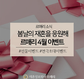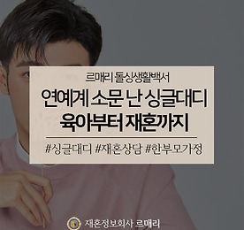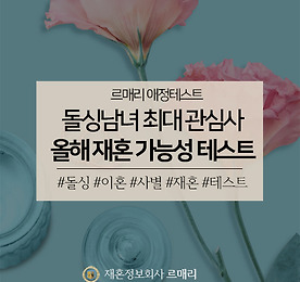 분류 전체보기 썸네일형 리스트형 [미팅파티] 맞선파티, 재혼파티, 미팅파티 끝판왕은? - 좋은 사람 만나는 방법이 따로 있을까요?- 자만추(자연스러운 만남 추구)는 어렵지 않나요?- 초혼도 아니고 돌싱이라 모임 나가기가 어려워요대한민국 돌싱남녀 분들이 재혼전문 결혼정보회사를 만나기 전까지, 가장 많이 하는 말을 꼽아봤습니다.재혼과 이혼에 대한 사회적 인식이 많이 개선되었지만, 결혼시장에서 여전히 돌싱이 불리하게 작용하는 것은 여전한데요. 특히 남들 앞에서 자신을 소개할 일이 많은 맞선파티, 미팅파티에서 부담으로 다가오기도 해요.누군가와 깊게 알아가는데, 결혼을 한 번 했다는 사실을 숨기는 건 득이 되지 않아요. 오히려 독이 될 수도 있죠. 숨기지도 못하고, 그렇다고 밝히기도 싫은 이혼 사실에, 새로운 사랑을 찾는 것 자체도 소극적이 되는 돌싱남녀 분들도 재혼상담소에서 많이 볼 수 있.. 더보기 소문 난 연예인 싱글대디, 한부모가정 육아부터 재혼까지 대한민국 돌싱남녀들의 재혼상담소, 재혼전문 결혼정보회사 르매리입니다.가정의 달, 그리고 계절의 여왕이라고 불리는 5월이 코앞으로 다가왔습니다. 최근, 가족의 다양한 형태가 열리면서 한부모가정과 재혼가정에 대한 편견도 많이 사라지고 있는 추세인데요. 매스미디어에서 대중들과 호흡하는 연예인들 중, 당당하게 돌싱이거나 한부모가정임을 밝히는 연예인이 늘어난 것도 여기에 영향을 미쳤다고 생각합니다.그런 의미에서 가정의 달 특집으로 소문 난 연예인 싱글대디, 그리고 한부모가정에 대해 알아볼 예정인데요. 유명 연예인들 중 싱글대디로 생활한 사례를 모아 자연스럽게 재혼가정에 관한 이야기를 해보겠습니다. 배우 이태성 배우 이태성 씨는 모 예능 프로그램을 통해 열 살 된 아들을 둔 싱글대디라는 사실을 밝혔는데요. 지난.. 더보기 돌싱남녀 집콕 취미생활, 집에서 핫한 취미 4선 안녕하세요, 재혼전문 결혼정보회사 르매리입니다.사회적 거리두기 기간이 예정보다 길어지면서 사람들과 만나지 못하고 외출을 하지 못해 지쳤다는 목소리가 날로 커지고 있어요. 하지만 이렇게 전국민이 사회적 거리두기에 동참하는 것과 달리 코로나19 확진자 수는 잦아들고 있다고는 하나, 여전히 사라지고 있지 않는 상황이에요.이런 상황에서 어쩌다보니 집돌이 집순이가 되어버린 대한민국 돌싱남녀들! 요즘 인터넷에서 핫한 '집에서 할 수 있는 놀이'들을 재혼전문 결혼정보회사 르매리가 쏙쏙 모아봤습니다. 천 번 주무르기 아이스크림 편 먼저 천 번 주무르기 아이스크림 편이에요. 최근 달고나커피가 인터넷에서 크게 유행하자 비슷하게 파생되어 나온 새로운 스타일의 음식 만들기 놀이인데요.준비물은 얼음과 설탕, 소금, 지퍼백.. 더보기 [이벤트] 돌싱남녀 화목하기 프로젝트 ‘봄, 花목찾기' 안녕하세요, 재혼전문 결혼정보회사 르매리입니다.매번 빵빵한 혜택을 자랑하는 역대급 선물 이벤트로, 대한민국 돌싱남녀를 응원하는 재혼전문 결혼정보회사 르매리가 돌싱남녀를 응원하기 위해 이번 달에도 풍성한 선물 보따리를 들고 왔는데요봄바람 타고 찾아 온 르매리의 역대급 프로젝트, 그 첫번째 이벤트는 바로 ‘봄, 花목찾기’ 이벤트입니다. 재혼전문 결호정보회사 르매리가 준비한 이번 이벤트는, 화창한 4월을 맞아 재혼가정에 평화와 안녕을 기원하기 위해 기획한 선물증정 행사인데요.이번 행사 상품은 소중한 사람과 함께 즐거운 저녁 식사 자리를 즐길 수 있는 외식상품권 위주로 마련했습니다. 추첨을 통해서 잠실 롯데호텔월드 라세느 뷔페이용권 2장, CJ푸드빌 외식계열 매장에서 사용할 수 있는 외식상품권 2장을 드리.. 더보기 [결혼테스트] 재혼, 올해 가능할까? 돌싱남녀 최대 관심사, 슬쩍 알려줄게 안녕하세요. 대한민국 돌싱남녀들에게 효자손보다 시원하고 유용한 재혼전문 결혼정보회사 르매리입니다.많은 재혼대상자들이 궁금하고, 또 궁금해 할 만한 주제라고 하면 당연히 '언제 재혼에 성공할 수 있을까' 라는 이야기겠죠? 빨리 재혼을 하고는 싶지만, 그렇다고 섣불리 진행하기에는 조심스럽고. 그래서 과연 언제쯤이면 좋은 사람과 제 2의 시작을 할 수 있을지, 많은 사람들이 궁금해한다고 해요. 그래서 재혼정보회사 르매리는 재혼에 꿈을 가진 사람들을 대상으로, 과연 올 해 안에 재혼을 할 수 있을지 점쳐볼 수 있는 유용한 테스트를 마련했답니다.바로 '1년 안에 재혼 가능?' 테스트인데요. 결혼확률 프로그램이라고도 불리는 이 테스트는 한부모가정지도사 자격증을 소유하고 있는 재혼전문가들이 상담을 통해 얻은 각종.. 더보기 돌싱남녀 집콕 취미생활, 이혼&재혼 관련 영상물 추천 안녕하세요, 대한민국 돌싱남녀의 돌싱 라이프를 구석구석 케어해주는 재혼전문 결혼정보회사 르매리입니다.벚꽃도 활짝 피었고, 날도 많이 포근해졌는데, 멈출 줄 모르는 코로나 19의 여파때문에 집에만 있는 날이 늘어나고 계신가요? 너무 오랫동안 집에 있다보니 결국 볼 것도 다 봤고 할 것도 다 했다! 싶은 돌싱남녀 분들도 많으실 것 같은데요. 그래서 오늘은 르매리 돌싱생활백서 집콕 라이프 특