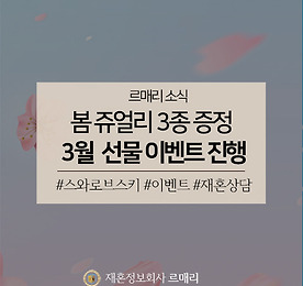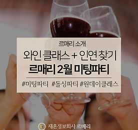 분류 전체보기 썸네일형 리스트형 [이벤트] 꽃을 닮은 액세서리 증정! 르매리의 화사한 3월 이벤트 [이벤트] 꽃을 닮은 액세서리 증정! 르매리의 화사한 3월 이벤트 안녕하세요, 재혼전문 결혼정보회사 르매리 재혼상담소입니다. 벌써 3월! 이제 날씨도 영상 기온을 기록하며 포근함을 안겨주고 있는데요. 봄이 되면 겨울잠에 빠졌던 연애세포도 꿈틀거리며 깨어난다는 사실, 성인이라면 다들 알고 계시죠? 네, 맞아요! 사랑하고 싶어지는 계절 봄이 찾아왔습니다! 봄바람이 살랑살랑 불어오기 시작하면, 나를 꾸미고 싶은 마음이 더욱 간절해진다고 하는데요. 재혼전문가 르매리가 정회원 및 준회원을 대상으로 조사해본 결과 30대가 넘어가기 시작할 때부터 꾸밈 비용이 상승한다고 해요. 그 이유는 액세서리 하나하나 신경을 써야하는 경우도 많아지고, 나이에 걸맞는 치장을 하려면 그만큼 고가의 브랜드를 소비하게 되기 때문인데요. .. 더보기 을지로 서점순례 - 돌싱남녀의 여유로운 주말 낮 보내는 방법 재혼하고 싶은데, 데이트는 커녕 연락할 상대도 없고설렘을 잊은 채 이번 주말도 집에서 보내게 생긴 돌싱남녀 주목!재혼정보회사 르매리의 돌싱생활백서 시간이 돌아왔습니다 :)추위가 많이 풀리고, 나들이의 계절 봄이 다가오고 있는데요현재 대한민국은 코로나 비상경보 발령 중!!날씨가 좋아도 외출보다 실내를 선호하게 되는 요즘입니다.하지만 마냥 집에만 있기 조금 지루한 날이 있잖아요?사람이 너무 많지 않으면서도여유롭고 알차게 주말을 보낼 방법이 뭐가 있을까요?을지로와 종각에 걸쳐 존재하는 대형서점을 속속들이 돌아다니며포근한 봄날을 책에 파묻혀 보낼 수 있는 코스를 알려드릴게요! 먼저 요즘 을지로에서 가장 핫한 서점, 아크앤북으로 발걸음을 옮겨봤어요. 아크앤북은 최근 SNS에서 ‘인생샷 성지’라고 불리.. 더보기 돌싱남녀 초호화 선물 빵빵 터지는 ‘화이트 밸런타인’ 이벤트 추운 겨울도 가고, 이제 본격으로 사랑이 꽃피는 계절인 봄이 다가오고 있습니다! 그런데 아직도 내 옆구리가 시린 건 기분 탓일까요? 하지만 걱정하지 마세요,대한민국 돌싱남녀 모두를 응원하는 재혼전문가 르매리가 있잖아요! 밸런타인데이를 앞두고, 돌싱 사랑의 전령사 르매리는 특별한 이벤트를 하나 준비했는데요. 내년 밸런타인데이는 꼭 로맨틱한 기운 가득하시라고 ‘화이트 밸런타인 이벤트’를 기획했답니다. 올해 겨울, 첫눈은 꼭 혼자가 아닌 둘이서 기다리길 바라는 마음을 가득 담아 르매리가 정성껏 선물을 준비하고, 포장하며, 재혼 희망자 여러분을 기다리고 있어요. 먼저 1등 선물로 재혼전문회사 르매리가 드리는 100만원 상당의 맞선권을 준비했어요. 이혼, 사별, 사실혼을 겪은 돌싱들 중에서 신원이 확실히 보장된 .. 더보기 대학로 연극 추천! 너의 목소리가 들려! 썸과 관계를 전진시키고 싶을 때! 코믹 한 스푼에 로맨틱까지 얹은 연극이 딱이죠?웃음 폭발, 달달구리 설렘까지 빵빵 터지는 핑크빛 초능력 로맨틱 코미디가 대학로에 상륙!입소문만으로 대학로를 평정해 제목을 듣자마자 “아 그거?”라는 반응이 절로 나오는 연극‘너의 목소리가 들려’ 추천 드립니다!과연 어떤 연극이길래, 재혼정보회사 르매리가 자신있게 추천하는지 한 번 살펴볼까요? 너의 목소리가 들려는 평화롭던 동네에 큰 화재가 발생한 10년 뒤 이야기를 그립니다화재가 발생한 건물에 새로 들어온 편의점에서 일하는 주인공 민준!그에게는 놀라운 비밀이 하나 숨겨져 있었는데요.바로 우연한 사고 이후 다른 사람의 생각을 들을 수 있는 엄청난 초능력의 소유자라는 사실! 그런 민준의 앞에 등장한 새로운 아르바.. 더보기 미팅파티에 와인 클래스를 얹었다! 르매리 2월 재혼파티 미팅파티, 대화만 하고 끝나던 흔한 만남이 지겨우셨던 분들에게 희소식!와인에 관한 다양한 정보를 얻는 시간과 내 파트너도 찾을 수 있는 일거양득의 찬스!재혼만을 위한 프리미엄 결혼정보회사 르매리에서 준비한 색다른 미팅파티로 초대합니다! 르매리가 준비한 올해 두 번째 미팅파티는 ‘밸런타인데이 빈&쇼콜라 파티’인데요.빈과 쇼콜라? 다소 생소한 이 이름은 프랑스어로 와인과 초콜릿을 뜻하는 말이기도 해요.와인과 함께 다양한 초콜릿 케이터링으로 어우러진 이번 파티를 상징합니다! 특히 이번 파티가 더욱 특별한 이유는, 원데이 클래스가 함게 진행되는 미팅파티라는 점!재혼전문 결혼정보회사 르매리가 처음 시도하는 이 독특한 미팅파티는요,최근 다양한 어플리케이션을 통해 원데이 클래스가 각광을 받는 트렌드에 주목.. 더보기 돌싱녀 눈길 사로잡는 눈호강 예능 4선! 안녕하세요. 돌싱들의 든든한 재혼동반자 르매리입니다. 긴 연휴도 다가오고 있는데요. 돌싱으로 돌아온 이후 시댁에 가야 할 필요도 없어서 시간이 널널해진 분들이 많을 것 같습니다. 시간이 넘칠 때, 예능만큼 좋은 게 또 있나요? 오늘은 명절 특집, 재미 보장은 물론이고 돌싱녀 눈까지 호강시킬 따끈따끈한 예능 프로그램을 모아봤습니다. 미스터트롯TV조선 2020.01.02. ~ 방영중(목) 오후 10:00 회차가 거듭될수록 종편의 새 역사를 쓰고