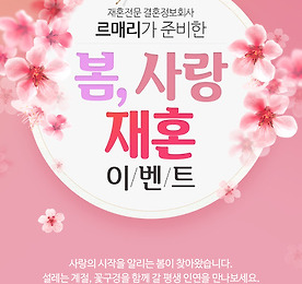 분류 전체보기 썸네일형 리스트형 돌싱부모에게 알려드리는 훌륭한 자녀교육 팁! 돌싱부모에게 알려드리는 훌륭한 자녀교육 팁! 재혼전문 결혼정보회사 르매리가 이번에는 돌싱부모를 위해 한부모 가정의 자녀교육을 알려드리고자 합니다. 혼자 자녀를 키우는 것이 쉽지 않다고 생각합니다. 아이를 어떻게 교육하고 어떻게 키워야 하는지 모든 돌싱부모들의 공통된 고민일 겁니다. 그래서 혼자서도 잘 교육을 할 수 있는 팁을 지금부터 알려드리겠습니다. 부모의 마음가짐만 있다면 이미 절반 이상은 성공하셨다고 보시면 됩니다. 과연 자녀를 교육하는 데에 있어서 가장 중요한 게 뭐가 있을까요? 처음으로 말해드리고 싶은 건 돌싱부모의 '욕심'입니다. 모든 부모님들의 소망은 자식이 잘 되는 것입니다. 또한 세상을 다 가져도 욕심은 끝도 없다고, 자녀들에게도 욕심을 부리게 됩니다. 여기서 부모와 아이들 관계에서 문제.. 더보기 돌싱모임을 위한 봄맞이 기차여행 추천! 돌싱모임을 위한 봄맞이 기차여행 추천! 재혼정보회사 르매리입니다. 주말에 추운 날씨와 비가 오는 관계로 많은 사람들이 대부분 꽃구경을 못 가셨을 텐데, 이번 주부터 다시 기온이 올라간다고 합니다. 그래서 이번에는 돌싱모임들이 꽃구경하러 가기 좋은 기차여행을 추천드릴까 합니다. 힘들지 않게 떠날 수 있는 당일 코스로 서울에서 벗어나 자연의 공기를 맡으며 휴식을 취하고 꽃도 보고, 관광명소도 보고, 맛있는 것도 먹을 수 있는 여행을 한번 떠나보는 게 어떨까요? 그럼 지금부터 르매리가 알찬 기차여행 코스 알려드리겠습니다! 1. 태안 튤립축제 꽃과 빛의 만남이라는 주제로 열리는 화려한 태안 튤립축제입니다. 태안 네이처월드 튤립축제장에서 꽃들이 만개한 봄을 느끼실 수 있습니다. 또한 사진작가들의 명소 꽃지해변이 .. 더보기 재혼정보회사 르매리,돌싱남 돌싱녀 봄맞이 봄, 사랑, 재혼 이벤트! 재혼정보회사 르매리,돌싱남 돌싱녀 봄맞이 봄, 사랑, 재혼 이벤트! 안녕하세요 재혼정보회사 르매리입니다. 며칠 사이 봄이 성큼 다가왔습니다. 봄비가 내리고 다음 주부터 서서히 날씨가 따뜻해진다고 합니다. 그래서 이제 곧 꽃구경이나 소풍 준비를 하는 돌싱남 돌싱녀를 위해 르매리가 4월 봄맞이 이벤트를 준비하였습니다. 이번 이벤트는 봄 소풍과 꽃구경에 필요하고 도움 되는 상품들로 준비하였습니다. 상품도 받고 르매리에서 운명의 짝도 찾아보시길 바랍니다. 재혼전문 결혼정보회사 르매리는 오직 재혼, 만혼자만 가입을 받고 있습니다. 그래서 이벤트 대상자 또한 재혼을 희망하는 돌싱남 돌싱녀 중에 이혼, 사별, 사실혼 대상자만 참여가 가능합니다. 또한 간단한 신원 조회를 하고 인증이 확인된 분들만 상품을 받을 수 있다.. 더보기 재혼전문 결혼정보회사에서 알려드리는 돌싱남 돌싱녀 봄 맞선복장 추천! 재혼전문 결혼정보회사에서 알려드리는 돌싱남 돌싱녀 봄 맞선복장 추천! 안녕하세요 재혼전문 결혼정보회사 르매리입니다. 봄바람이 살랑살랑 불어오는 계절, 꽃향기도 나면서 설레는 기분이 듭니다. 봄 하면 떠오르는 것이 바로 만남인데 이성과의 맞선, 소개팅을 많이 하실 겁니다. 하지만 돌싱남 돌싱녀가 걱정하는 것 중에 하나가 어떤 옷을 입어야 될지 고민을 많이 하실 겁니다. 아침과 밤에는 춥고, 낮에는 더운 어정정한 날씨에 과연 어떤 옷을 입고 나가야 될지 지금부터 알아보러 가겠습니다! 우선 돌싱남 같은 경우 아재 패션의 선구자들의 미중남 패션을 토대로 남녀노소 누구에게나 댄디함을 선물하는 곤색을 추천합니다. 미중남 아재 패션은 슈트를 주로 입고 다니는데, 대부분 화이트 슬랙스에 곤색 재킷을 입거나 베이지 슬랙.. 더보기 부담감 NO, 재혼대상을 만날 수 있는 비어파티 4월 참가신청 중! 부담감 NO, 재혼대상을 만날 수 있는 비어파티 4월 참가신청 중! 오늘 최고온도가 23도까지 올라가는 푸근한 봄 날씨였습니다. 밖에는 개나리와 벚꽃 등 봄꽃들이 개화를 시작하여 설레면서도 한편으로는 쓸쓸함을 느끼는 돌싱들을 위해, 이번에도 어김없이 돌싱들의 마음속에도 봄이 오길 기원하며, 재혼정보회사 르매리가 4월 불금 미팅파티를 개최하려고 합니다! 주말에 시간 내기 어려우셨던 돌싱들은 이번 기회를 통해 4월 미팅파티에 참석해보세요~ 재혼전문 결혼정보회사 르매리는 재혼만을 대상으로 스페셜 비어파티를 진행합니다. 한 주의 스트레스를 풀어내는 금요일! 무제한의 시원한 수제 맥주 그리고 분위기 있는 재즈 공연까지! 격식 있고 딱딱한 파티 진행이 부담스러웠던 돌싱들은 프리토킹으로 자유로운 파티를 즐겨보시길 바.. 더보기 돌싱남녀에게 전하는 미세먼지의 심각성 돌싱남녀에게 전하는 미세먼지의 심각성 재혼정보회사 르매리입니다. 이제 추운 날씨가 다 지나가고 따뜻한 봄 날씨가 겨우 찾아왔는데, 현재 '침묵의 살인자'로 불리는 미세먼지가 대한민국 전역을 잿빛으로 만들어버렸습니다. 26일인 오늘 현재 미세먼지 농도가 서울이 93, 경기가 94, 인천이 제일 높은 수치 104까지 올라가 오늘 최고치를 찍었으며, 다른 지역도 마찬가지로 낮은 수치는 아니었습니다
