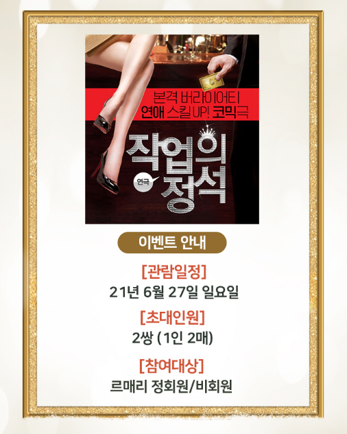 연극초대 이벤트는 재혼정보회사 르매리 공식홈페이지에서 확인하실 수 있구요. 2021년 6월에는 인기 연극 '작업의 정석' 초대권을 증정하고 있습니다. 재혼을 진지하게 고민 중인 돌싱남녀라면 누구나 참여할 수 있고요, 당첨되신 분들에게는 개별적으로 연락해 예약까지 도와드리고 있습니다.