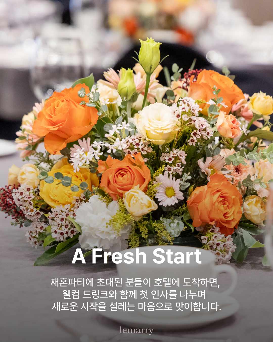 재혼파티에 초대된 분들이 호텔에 도착하면, 웰컴 드링크와 함께 첫 인사를 나누며 새로운 시작을 설레는 마음으로 맞이합니다. 가벼운 인사와 대화로 어색함을 덜고, 파티를 즐길 준비를 합니다.