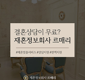 결혼상담 썸네일형 리스트형 재혼정보회사 르매리가 준비한 5월의 선물이벤트 - 'Present 5'를 소개합니다. 안녕하세요, 재혼정보회사 르매리입니다. 저희 르매리가 가정의 달, 5월을 맞아 이혼가정 및 재혼가정의 화합을 기원하며 특별한 선물 이벤트를 준비했습니다. 대한민국 돌싱남녀라면 누구나, 신청만으로 행운을 얻을 수 있는 기회! 먼저 신청해주신 분들 중, 1분을 추첨해 LG 스타일러를 선물로 드립니다. 구김은 물론 살균소독, 탈취까지 한 번 써보면 없이는 못 산다고 해서 최근 가정주부들 사이에서 매우 핫하죠? 그리고 2분에게 다이슨 공기청정기, 10분에게 신세계 백화점 상품권, 20분에게 CGV 영화 예매권, 30분에게는 스타벅스 기프티콘을 드립니다. 본 행사는 돌싱남녀 및 만혼대상자만 참여할 수 있으며, 이를 확인하기 위해 신청 시 별도의 확인 절차가 있을 수 있습니다. 만약 지원 자격이 미달일 경우 당첨이.. 더보기 재혼전문 결혼정보회사 르매리는 설날에도 정상 영업합니다. 재혼전문 결혼정보회사 르매리 설날 연휴 정상영업! 안녕하세요, 재혼전문 결혼정보회사 르매리입니다. 2021년 새해가 밝은 지 엊그제같은데, 벌써 2월 중순이 다가오고 있습니다. 저희 르매리는 올해는 꼭 재혼에 성공하고 싶다는 돌싱남녀 분들과 함께 하느라 매우 바쁜 시간을 보냈습니다. 다른 분들은 새해 계획, 잘 지키고 계신가요? 만약 새해 계획으로 재혼 성공을 세워놨는데, 아직 좋은 사람을 만나지 못해 고민 중인 분들이 계신가요? 그런 분들을 위해, 르매리가 역대 최고로 풍성한 설날 혜택을 마련했는데요. 어떤 혜택들이 있는지 함께 알아볼까요? 르매리는 정상영업! 르매리 자체 조사팀에 따르면 돌싱남녀 분들은 이미 한 번 가정의 해체를 경험했기 때문에, 명절을 특히 불편하게 여긴다고 합니다. 재혼대상자가 아.. 더보기 재혼상담소 르매리, 연말연시 재혼상담 서비스 강화 재혼상담소 르매리, 연말연시 재혼상담 서비스 강화 안녕하세요, 돌싱남녀 및 만혼대상자들을 대상으로 하는 재혼상담소 르매리입니다. 벌써 2020년도 일주일 밖에 남지 않았어요. 지금 르매리는 재혼상담을 위해 방문하신 분들로 문전성시를 이루고 있는데요. 올 해 결혼을 꼭 하고 싶었지만 다양한 사정에 의해 뜻을 이루지 못한 분, 그리고 내년에는 꼭 결혼을 하고 싶은 분들이 결의를 다지는 시기기 때문이죠. 그래서 재혼상담소 르매리는 한 해 중 가장 재혼상담소가 붐비는 이 시기를 대비해 얼마 전, 재혼상담 서비스를 강화한 바 있습니다. 먼저 저희 재혼상담소 르매리에 근무하는 모든 커플매니저 분들을 대상으로 전문 상담 교육을 진행했는데요. 재혼의 특수성을 이해하고 돌싱남녀의 마음을 보다 공감할 수 있는 시간이 되었.. 더보기 결혼상담 무료 재혼정보회사, 르매리 안녕하세요 :)결혼상담 무료 재혼정보회사 르매리입니다.오늘은 오랜만에 르매리의 자기소개 시간을 가져보려고 합니다.재혼상담소를 찾는 30대재혼, 40대재혼, 50대재혼에 생각이 있으신 분들에게 큰 도움이 되실 테니 꼭 봐주셨으면 해요. 자, 그럼 떠나볼까요? 르매리의 가장 큰 특징은 재혼을 전문으로 다루고 있는 결혼정보회사라는 점입니다. 국내에는 수많은 결혼정보회사가 있는데요.재혼만을 전문적으로 다루는 결혼정보회사는 없습니다. 타사의 경우 대부분 초혼과 재혼을 겸하고 있기에 전문성이 떨어질 수밖에 없죠.따라서 르매리가 국내 유일 재혼정보업체라고 말씀드릴 수 있으며 이혼이나 사별, 사실혼, 자녀 문제를 누구보다 가장 잘 아는 결혼회사라고 할 수 있습니다. 그렇다면 커플 매니저분들도 중요하겠죠? 재혼회사 르.. 더보기 이전 1 다음