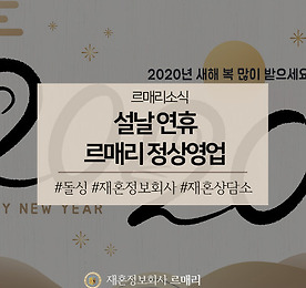 르매리, 설날에도 정상영업! 명절기간 방문자에게 특별한 혜택 증정! 안녕하세요, 재혼전문 결혼정보회사 르매리입니다! 설날, 추석 등… 명절만 되면 “결혼은 언제 하냐” 같은 잔소리, 정말 지긋지긋하셨죠? 결혼을 했다가 다시 싱글로 돌아온 돌싱 분들이라고 해서 잔소리에서 자유로울 수 있을까요? 어른이 되어 잔소리할 사람이 없어졌다고 생각했건만, 이제는 친구는 물론 밑에서도 잔소리가 들려오는 상황! 그리고 설날이 되면 가족들도 많고 북적북적, 정말로 ‘내 가족’들과 보내는 알콩달콩한 시간들.정말 결혼을 해봐야지만 알 수 있는 즐거운 설렘이죠?​이러한 감정일 이미 겪어 본 돌싱 분들이라면 특히 명절이 더욱 외롭게 느껴지실 수 있는데요.​그렇기 때문에 더더욱 재혼 생각이 간절한 돌싱 분들을 위해 재혼전문 결혼정보회사 르매리는이번 설날 연휴 정상 운영을 결정했습니다!​특히 명절기.. 더보기
